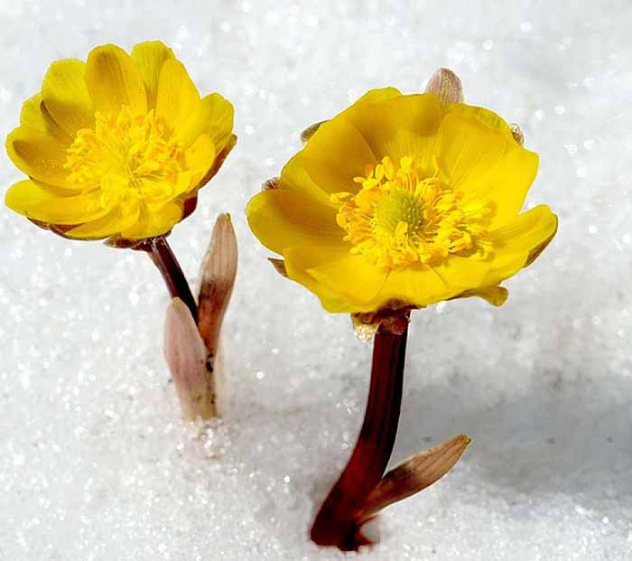 冰凌花(顶冰花、冰了花、福寿草)多年生宿根草木,高20厘米-35厘米,叶二型,花单生于主茎和少数分枝的顶端。侧金盏花植株矮小,有傲春寒的特性,金黄色的花朵,顶冰而出,素有“林海雪莲”之美称。冰凌花属于毛茛科,侧金盏属,其学名为侧金盏花。不同地域给它赋予了不同的名字:冰凌花、冰了花、冰凉花、冰郎花、冰顶花、冰里花、冰溜花、金盅花、金盏花、福寿草和雪莲花等。 此种植物有开花早的特点,在黑龙江省牡丹江地区的张广才岭林区、完达山和小兴安庆安林区通常在3月中下旬、冬末春初冰雪尚未消融时发芽,开花,在新叶开放同时,其顶部着生一金色小花,如盅、盏状,故名为金盅花、金盏花。其花茎为1.5~4cm。开花时间可持续到5月初。单花期为10d左右。可以填补北方高寒地区冬末、早春城市绿化无花的空白。 |